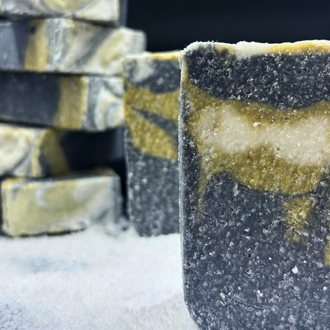 Ingredients: Sodium Cocoate, Sodium Tallowate, Maris Sal (Sea Salt), Pinus Sylvestris Leaf Oil, Cedrus Atlantica Bark Oil, Chlorophyllin, Activated Charcoal, Kaolin